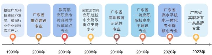 机电一体化技术专业创办于1999年,2000年被确定为广东省重点专业,2008年被确定为国家示范性高等职业院校中央财政重点建设专业,2010年为确定为广东省高职教育示范性专业,2016年被确定为广东省一流高职院校高水平专业, 2020年被确定为广东省第一批高水平专业群机电一体化技术专业群龙头专业。