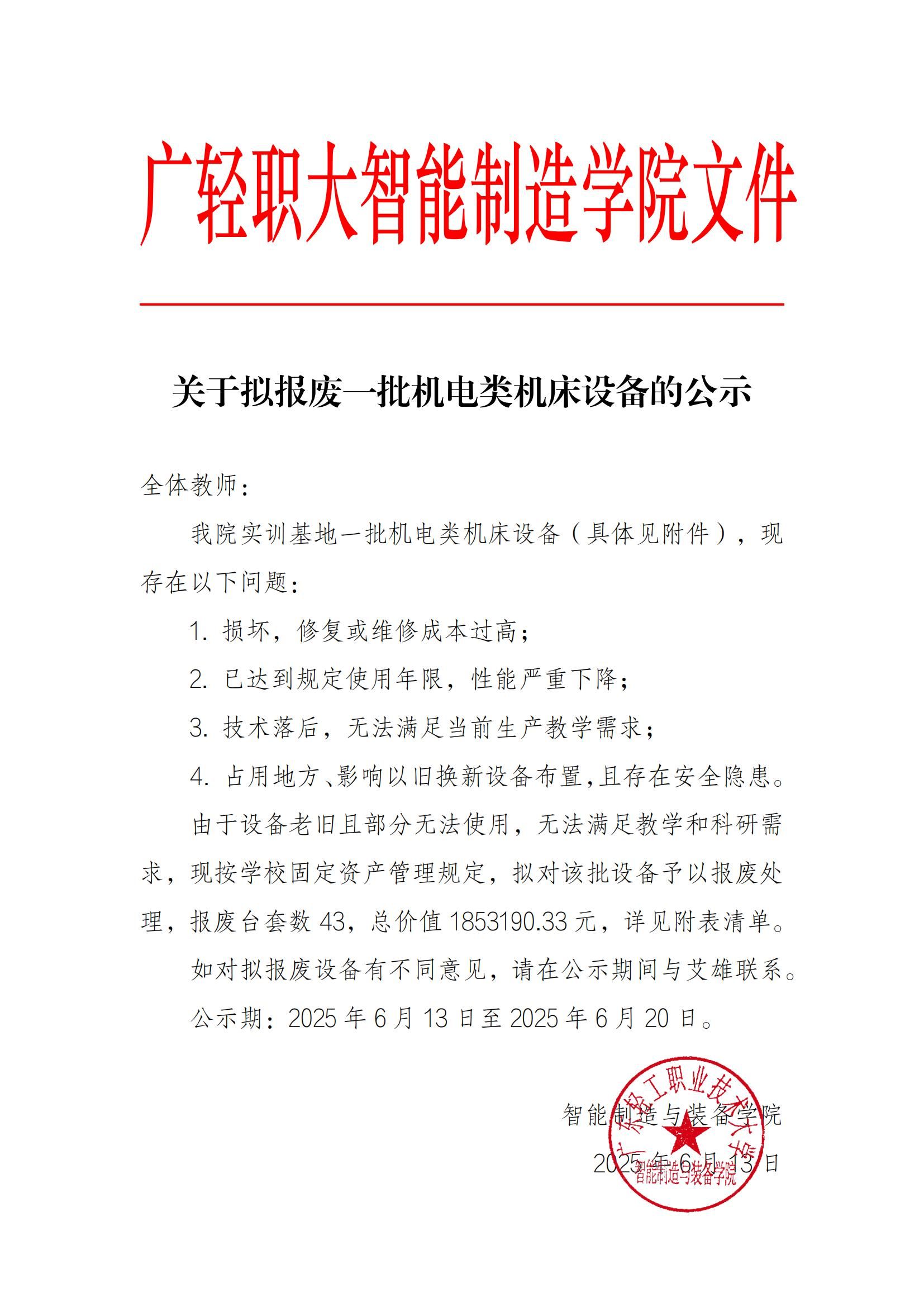 关于拟报废一批机电类机床设备的通知