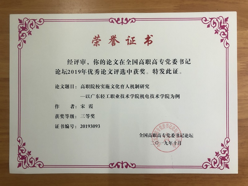 10月10日,全国高职高专党委书记论坛学术委员会发布了《关于2019年论文评审结果的通知》(学术委员会〔2019〕7号),公布了全国高职高专党委书记论坛2019年论文获奖名单。我们宋霞老师的论文《高职院校实施文化育人机制研究——以广东轻工职业技术学院太阳集团tyc5997为例》荣获三等奖。