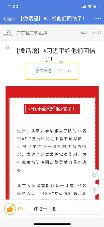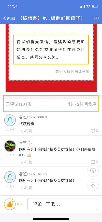 近段时间以来,全国各高校纷纷开展大学习、大讨论、大实践,掀起了全国范围内学习习近平总书记重要回信精神的热潮。我们易班工作站采用微话题留言的形式,动员同学们在评论区留言,分享自己的心得感受。