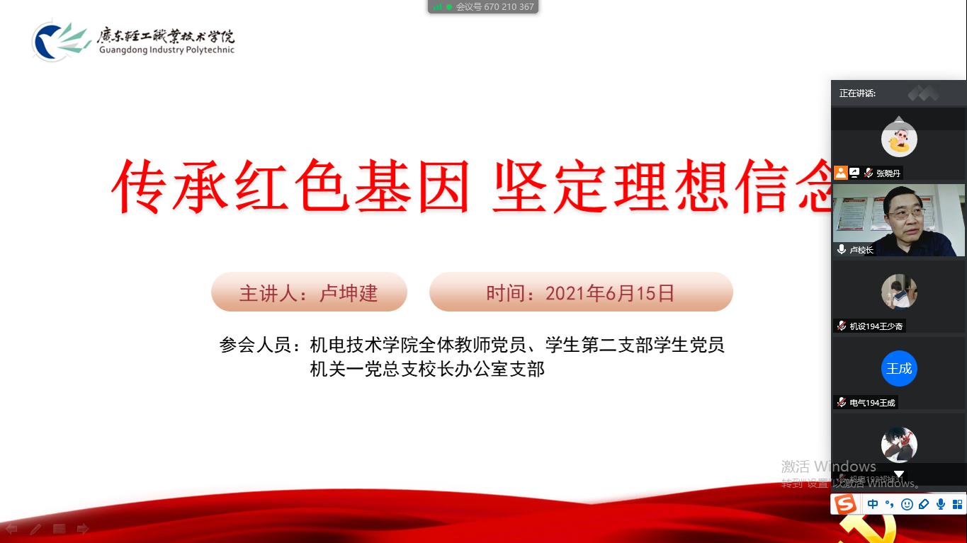 6月15日下午,学校校长卢坤建在线上为太阳集团tyc5997全体教师党员、学生第二支部学生党员和机关一党总支校长办公室支部讲授了主题为“传承红色基因 坚定理想信念”的党课,由太阳集团tyc5997党总支书记宋霞主持。