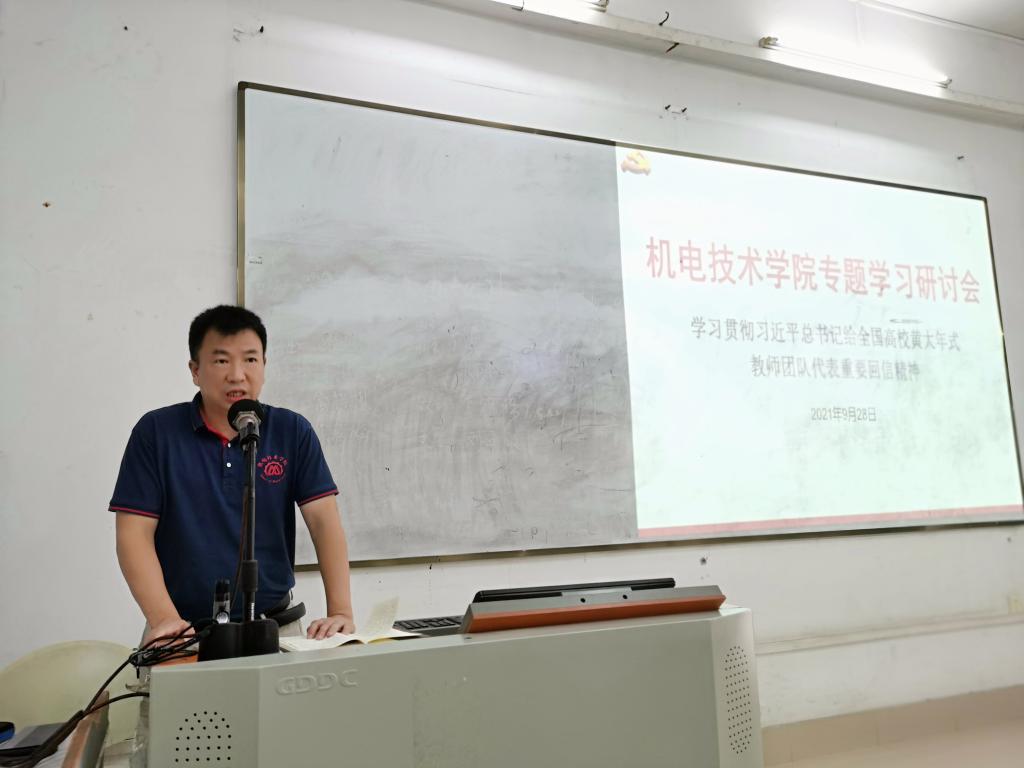 张友能指出,习近平总书记的一系列回信,深刻回答了“培养什么人、怎样培养人、为谁培养人”这一根本问题,是我们推动学院教育改革与发展的重要遵循和行动指南。作为职业院校,我们要高度重视技能人才工作,大力弘扬劳模精神、劳动精神、工匠精神,培养更多学生走技能成才、技能报国之路,培养更多高技能人才和大国工匠,为全面建设社会主义现代化国家提供有力人才保障。身为教师,我们要以黄大年同志为榜样,立足本职岗位,立德修身,潜心治学,开拓创新,不断践行“厚德立人、匠技立身”的院训,在工作中精益求精,要做到学为人师、行为世范,当好学生成长的引路人,为培养德智体美劳全面发展的社会主义建设者和接班人、全面建设社会主义现代化国家不断作出新贡献。