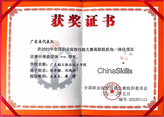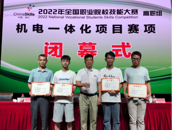 8月28日,2022年全国职业院校技能大赛高职组“机电一体化项目”赛项在浙江机电职业技术学院落下帷幕,全国29个省市区共55支队伍参赛参加了本次大赛。我们20级机电一体化技术专业刘鸿源、陈泽瀚两位同学发挥出色,以总分第二名的好成绩荣获该赛项一等奖,指导教师关春天、廖辉荣获优秀指导教师称号。