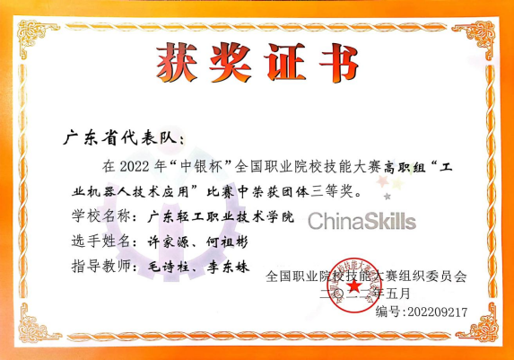8月26日,2022年“中银杯”全国职业院校技能大赛高职组“工业机器人技术应用”赛项在山东职业学院落下帷幕。本次赛项共有来自全国29个省(市、区)的59支参赛队参赛,太阳集团tyc5997工业机器人技术专业何祖彬(机器人192)、许家源(机器人212) 组成的团队荣获三等奖。