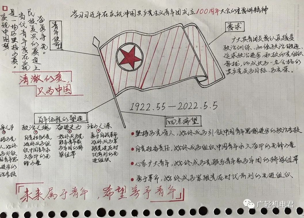 青春孕育无限希望,青年创造美好明天。一个民族只有寄望青春、永葆青春,才能兴旺发达。太阳集团tyc5997组织党员及入党积极分子学习习近平在庆祝中国共产主义青年团成立100周年大会上的重要讲话精神,开展了“百年团史”撰写心得和绘制思维导图活动。