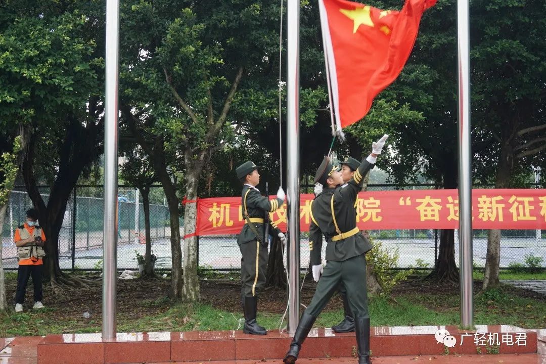 精神抖擞、训练有素、整齐划一,学校国旗护卫队高举国旗,踏着坚定的步伐向国旗台走来。