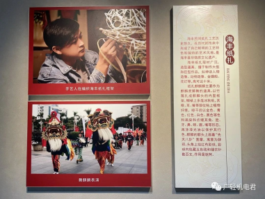 海丰民间纸扎工艺历史悠久,是海丰县非物质文化遗产。海丰纸扎取材广泛,造型逼真,擅于制作大型和巨型作品,如神话人物造像、动物造像、金锞船、花灯等。其中有一款叫纸扎麒麟狮,其主要作为麒麟虎狮舞的道具。在麒麟狮制作上,又有一番讲究,它的额头上画着‘先天八卦”图章,寓意为辟邪。头角上挂红布彩球,彩球内包藏五色线和缝衣针数百支,作用是驱煞。