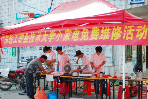 在永丰丰顺广场,一个简易却热闹的维修点格外引人注目。突击队员们熟练地拆解电器、检测电路、更换零件,不一会儿就让“罢工”的电风扇重新转动起来。“这些大学生真厉害!”捧着修好的电饭煲,村民王伯连连称赞,“去县城修要花上百元,他们分文不收就解决了。”