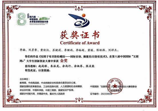 2 | 安固子母牙防松螺纹(指导学生获奖) | 2023 | 1 | 第八届中国国际互联网+大学生创新创业大赛,国赛金奖 | 中国国际“互联网+”大学生创新创业大赛组委会 |