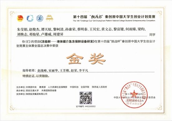 1 | 冻极鲜--液体媒介急冻保鲜设备研发(指导学生获奖) | 2024 | 1 | 第十四届“挑战杯”中国大学生创业计划竞赛,主体赛国赛金奖 | 第十四届挑战杯中国大学生创业计划竞赛全国组织委员会 |